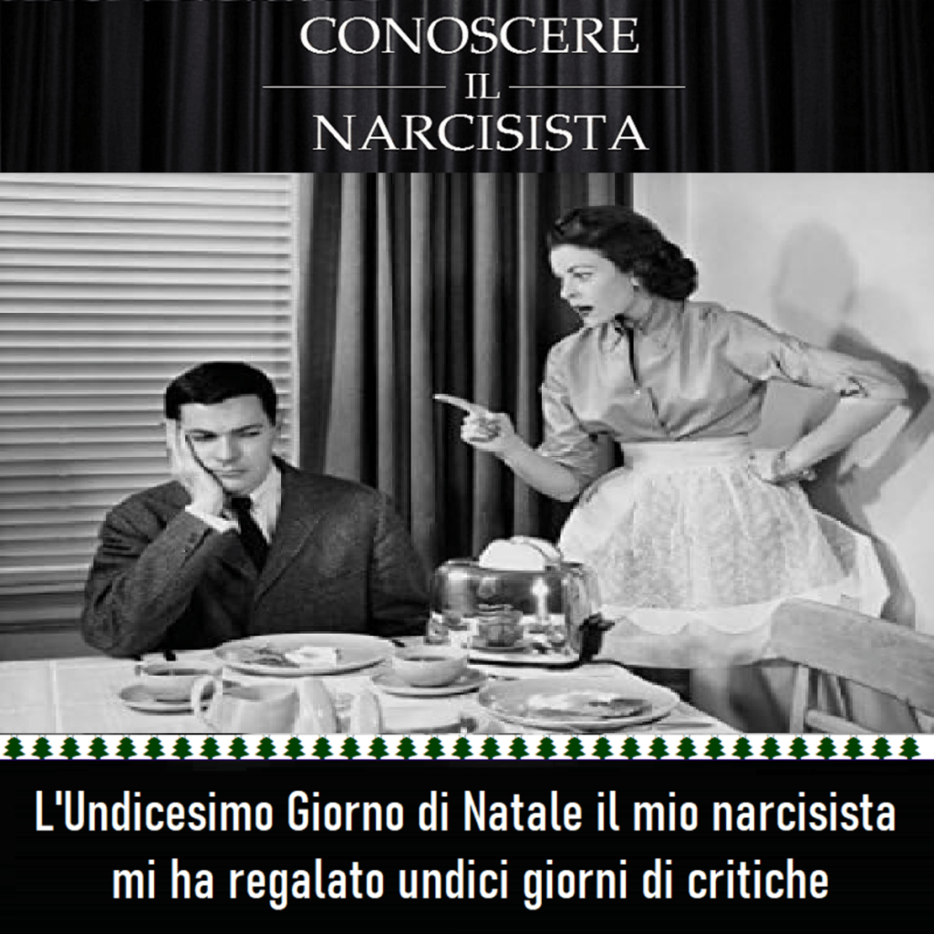 I NARCI-GIORNI NATALIZI – N. 11 “L’Undicesimo Giorno di Natale il mio narcisista mi ha regalato undici giorni di critiche”Paola De Carli24 Dicembre 2020 Questa è una meme. Traduzione di PAOLA DE CARLI dal testo originale di H.G. TUDOR