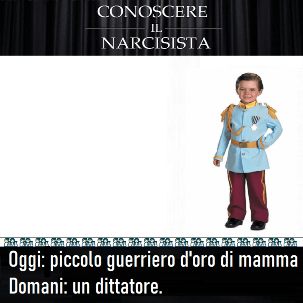 PICCOLI FIGLI ADULTI DI NARCISISTI – N. 38 “Oggi: piccolo guerriero di mamma. Domani: un dittatore”Paola De Carli9 Marzo 2018 Questa è una meme. Traduzione di PAOLA DE CARLI dal testo originale di H.G. TUDOR